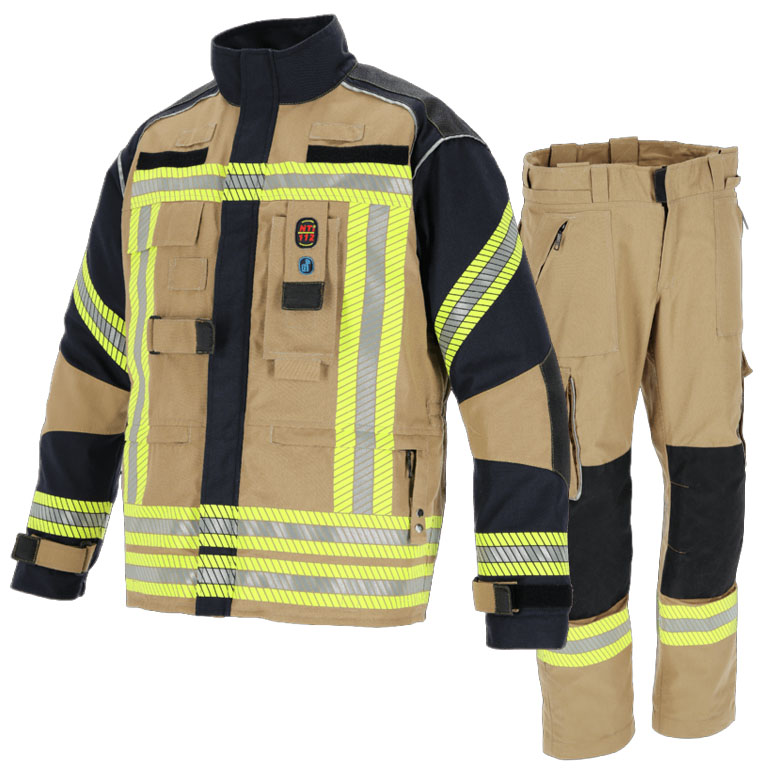 - 112-100 nach EN469 und 112100H nach EN469 und HuPF 11/20- Leistungsstufen: X2/Y2/Z2; EN 1149-5 - Elektrostatische Eigenschaften- EN ISO 13688 - Allgemeine Anforderungen an Schutzbekleidung; ISO 16604 - Virenschutz- Oberstoff: Nomex® Outershell Tough (75% Meta-Aramid (Nomex®)/23% Para-Aramid (Kevlar®)/2% Antistatikfaser)- Nässesperre: General - Electric® ePTFE Membrane mit GE® Direct Diffusion Technology- Isolationslage/Innenfutter: Nonwoven Spunlace meta-Aramid (Nomex®) / para-aramid (Kevlar®) versteppt mit 50% Aramid / 50% Viskose FR- doppelt genähte Reflexstreifen gelb/silber/gelb- Silicon-Carbon Verstärkung an Ellebogen- Schulterpolsterung für Atemschutzgeräte- Revisionsöffnung mit beidseitigem Zugang zu Membran und Isolationsseite- Verstellbarer Armriegel- Reflexpaspel zur optimalen Körperkonturerkennung- Selbstleuchtendes Rückenschild mit Aufschrift FEUERWEHR - Thermo-Mann Test mit 0 Verbrennungen- Saugsperre gegen Kriechnässe- Strickbündchen mit Daumenschlaufe- Liefergrößen: 42/44-66/68 + K- und L- Größen