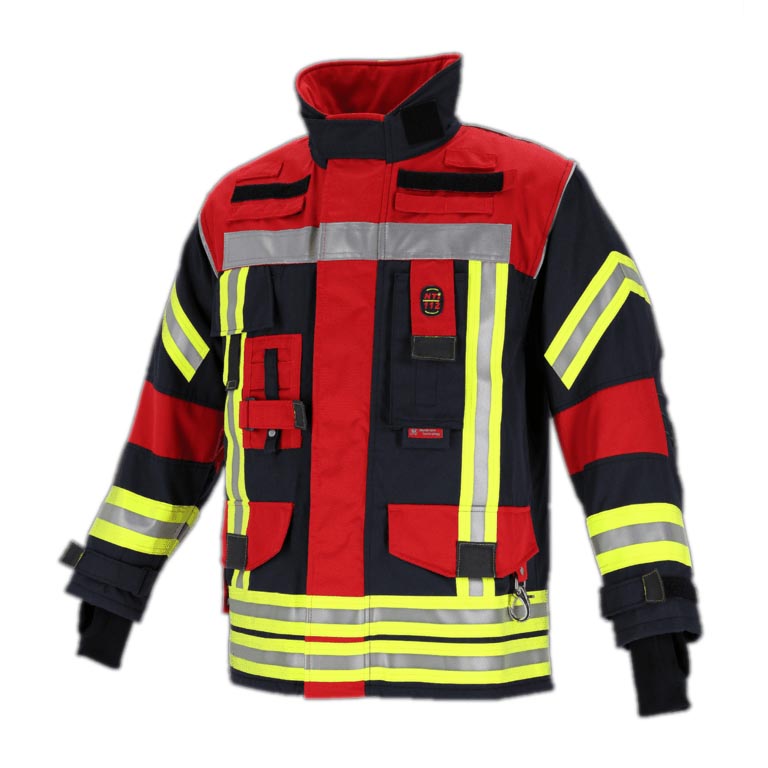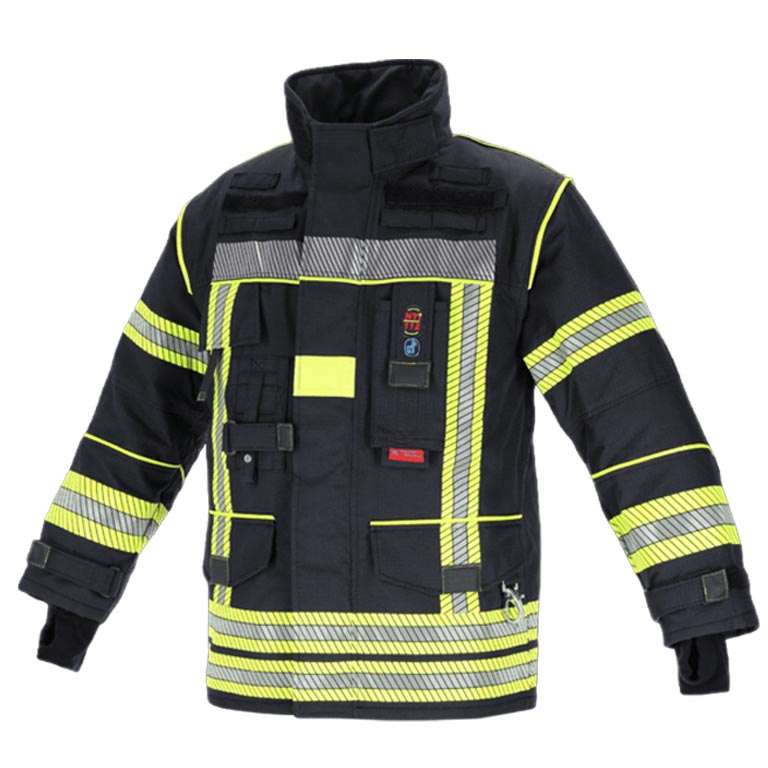 - 112-100 nach EN469 und 112100H nach EN469 und HuPF 11/20- Leistungsstufen: X2/Y2/Z2; EN 1149-5 - Elektrostatische Eigenschaften- EN ISO 13688 - Allgemeine Anforderungen an Schutzbekleidung; ISO 16604 - Virenschutz- Oberstoff: Nomex® Outershell Tough (75% Meta-Aramid (Nomex®)/23% Para-Aramid (Kevlar®)/2% Antistatikfaser)- Nässesperre: General - Electric® ePTFE Membrane mit GE® Direct Diffusion Technology- Isolationslage/Innenfutter: Nonwoven Spunlace meta-Aramid (Nomex®) / para-aramid (Kevlar®) versteppt mit 50% Aramid / 50% Viskose FR- doppelt genähte Reflexstreifen gelb/silber/gelb- Silicon-Carbon Verstärkung an Ellebogen- Schulterpolsterung für Atemschutzgeräte- Revisionsöffnung mit beidseitigem Zugang zu Membran und Isolationsseite- Verstellbarer Armriegel- Reflexpaspel zur optimalen Körperkonturerkennung- Selbstleuchtendes Rückenschild mit Aufschrift FEUERWEHR - Thermo-Mann Test mit 0 Verbrennungen- Saugsperre gegen Kriechnässe- Strickbündchen mit Daumenschlaufe- Liefergrößen: 42/44-66/68 + K- und L- Größen